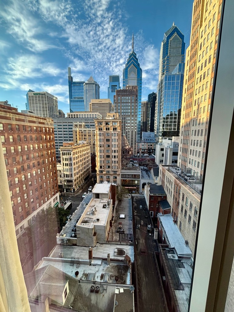 We arrived by Amtrak and checked into the Hyatt Centric Center City, where our room window framed the Philadelphia skyline like a postcard. Glass towers gleamed in the evening light, while older brick buildings whispered stories of the past.