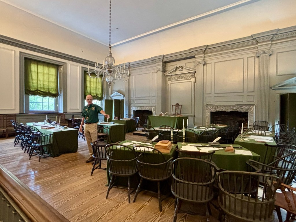 Inside Independence Hall, we saw the very room where the Declaration of Independence was debated and signed. The green tablecloths, ink wells, and wooden chairs almost made it feel like Jefferson and Franklin had just stepped out for a coffee break.