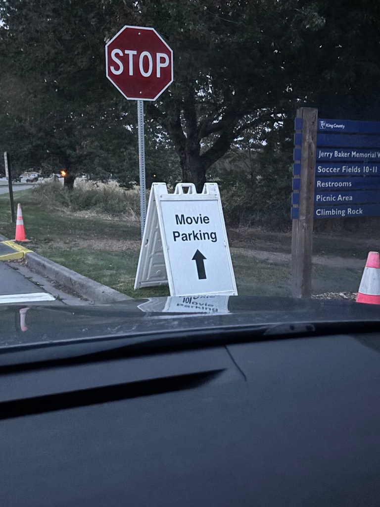 We followed the “Movie Parking ⬆️” signs that looked like someone printed them during their lunch break. When we got there, they actually measured the cars to make sure no one blocked the screen. Loki offered to be the measuring stick. They declined. Species discrimination at its finest.