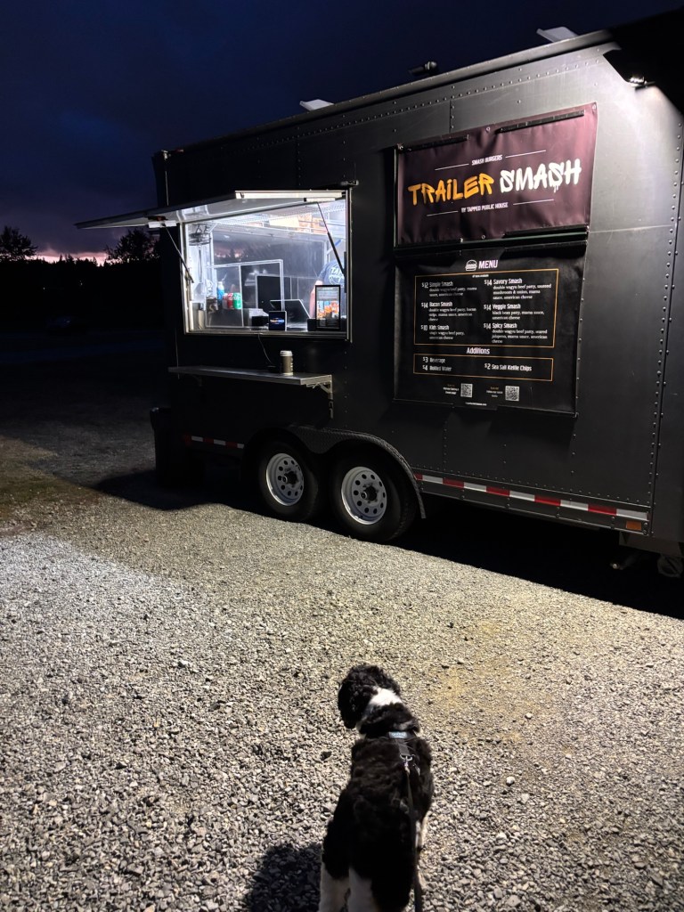 Cloudy night, glowing food trucks, romantic comedy, sleeping dog…